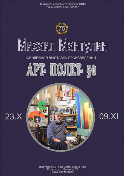 23 октября 2025 года в Центральном выставочном зале Дома художников, открылась выставка «Арт-полет-50» – юбилейная экспозиция работ Михаила Мантулина, приуроченная к семидесятипятилетию со дня рождения художника и пятидесятилетию творческой деятельности. Мантулин – ведущий мастер контравангарда и неоконцептуализма, президент Академии аналитического искусства (АКАНИС) – международного объединения художников-космистов. Архитектор, арт-дизайнер, художник, он уже полвека живет в Калуге. За эти годы, созданные им арт-объекты экспонировались в музеях, галереях и выставочных залах России, Восточной и Западной Европы, Ближнего и Дальнего Востока. Он – автор уникальных архитектурно-художественных ансамблей, член Союза художников России и Творческого союза художников России. Мантулин награжден Бронзовой, Серебряной и Золотой медалями Творческого союза художников России , Серебряной и Золотой медалями Союза художников России. Он обладатель Гран-при 3 Международного салона в Монтабане (Франция). Заслуженный работник культуры Калужской области. В экспозиции представлены работы (живописные полотна, графические листы, эмали, коллажи, арт-объекты и ассамбляжи), созданные на всем протяжении творческого пути художника.