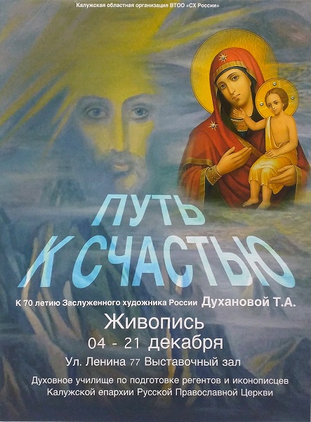 Эти строки русского поэта Апполона Майкова можно привести в качестве эпиграфа к выставке «Путь к счастью», приуроченной к 70-летнему юбилею Заслуженного художника России, Татьяны Анатольевны Духановой, открывшейся 4 декабря в выставочном зале Калужского Дома Художника. Потому как путь к счастью немыслим без чувства долга, веры и любви. Они помогают и в наставнической деятельности, которой художница посвятила без малого почти три десятилетия своей жизни.